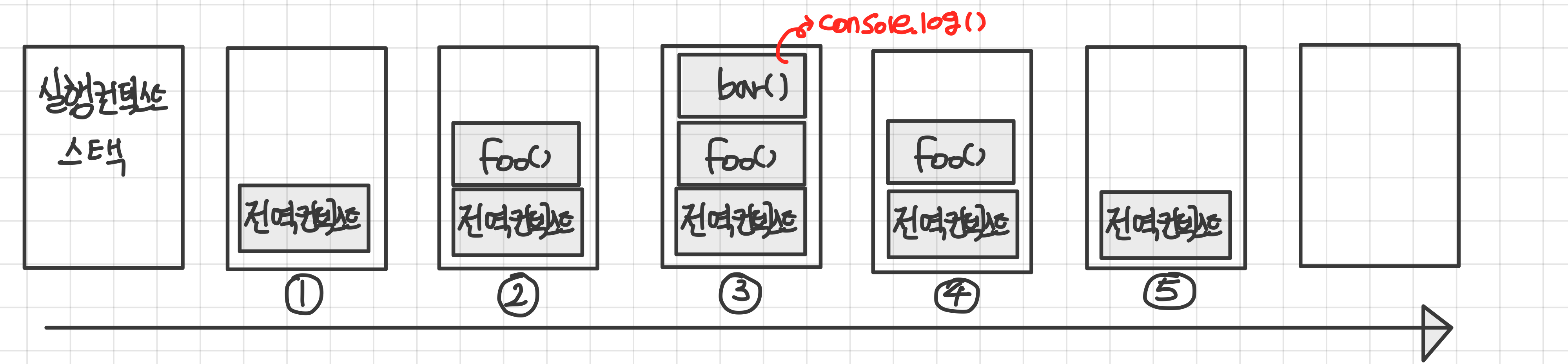 foo()가 호출되어 제어권이 foo로 이동한다. 지역변수 y와 bar함수가 등록되며, 렉시컬 환경을 통해 스코프 체인이 형성된다.