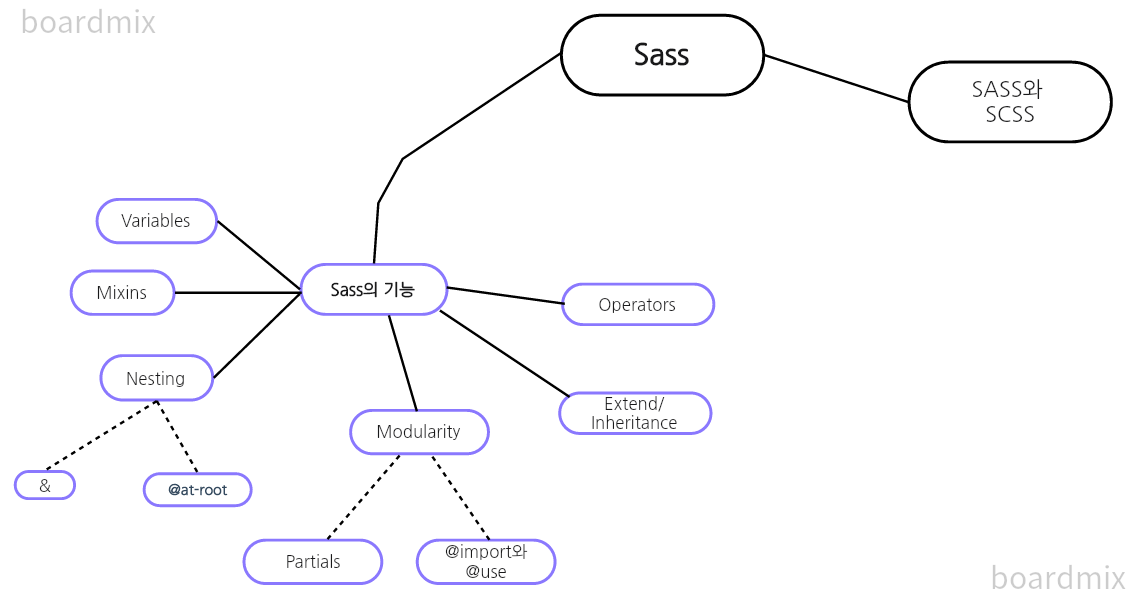 - Sass는 CSS를 모듈화 하고 쉽게 유지보수 할 수 있는 모듈화 기능을 제공한다.
